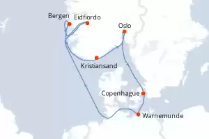 Itinerario : Copenhague, Warnemunde, Eidfiordo, Bergen, Kristiansand, Oslo, Copenhague