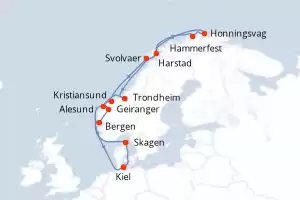 Itinerario : Kiel, Bergen, Geiranger, Kristiansund, Svolvaer, Honningsvag, Hammerfest, Harstad, Trondheim, Alesund, Skagen, Kiel