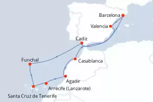 Itinerario : Barcelona, Valencia, Casablanca, Agadir, Arrecife (Lanzarote), Santa Cruz de Tenerife, Funchal, Cadiz, Barcelona