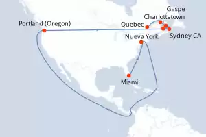 Itinerario : Quebec, |La baie, Siete Islas, Havre Saint Pierre, Sidney, Halifax, Nueva York, Miami