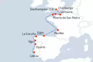 Itinerario : Southampton, Le Havre, Puerto de San Pedro, Cherburgo, Pauillac, Gijón, La Coruña, Vigo, Oporto, Lisboa
