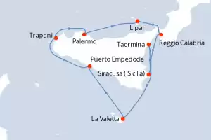 Itinerario : La Valetta, Puerto Empedocle, Trapani, Palermo, Lipari, Salerno, Reggio Calabria, Taormina, Siracusa ( Sicilia), La Valetta