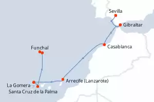 Itinerario : Sevilla, Gibraltar, Casablanca, Arrecife (Lanzarote), Santa Cruz de la Palma, La Gomera, Ilha Deserta Grande, Funchal