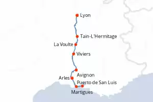 Desde los viñedos, trabajados por el hombre a lo largo de los siglos, hasta la salvaje Camarga, la vía fluvial presenta algunas joyas. Los miradores del MS Camargue y las excursiones organizadas durante las escalas invitan a los pasajeros a visitar ciudades como Cluny, Macon, Vienne, Tournon, Viviers, Avignon y Arles, todas ellas, sin duda, bajo una luz diferente.