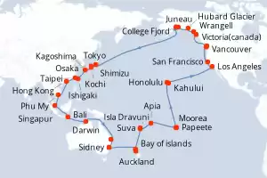 Itinerario : Sidney, Auckland, Bay of islands, Suva, Isla Dravuni, Apia, Papeete, Moorea, Honolulu, Kahului, Los Angeles, San Francisco, Victoria, Vancouver, Wrangell, Juneau, Hubard Glacier, College Fjord, Whittier, Tokyo, Shimizu, Osaka, Kochi, Kagoshima, Ishigaki, Taipei, Hong Kong, Phu My, Singapur, Bali, Darwin, Brisbane, Sidney