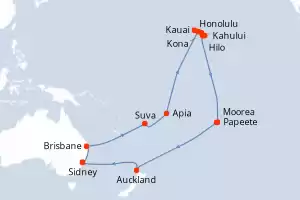 Itinerario : Sidney, Brisbane, Suva, Apia, Honolulu, Kauai, Kahului, Hilo, Kona, Papeete, Moorea, Auckland, Sidney