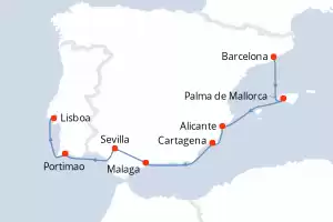 Itinerario : Barcelona, Palma de Mallorca, Alicante, Cartagena, Malaga, Sevilla, Portimao, Lisboa