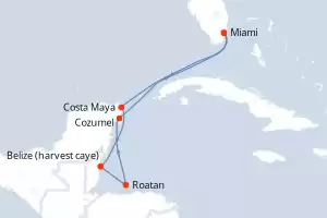Itinerario : Miami, Costa Maya, Belize (harvest caye), Roatan, Cozumel, Miami