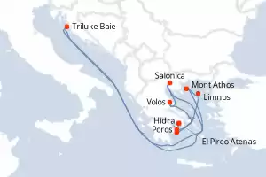 Itinerario : El Pireo Atenas, Poros, Volos, Salónica, Triluke Baie, Mont Athos, Limnos, Hidra, El Pireo Atenas
