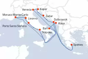 Itinerario : Venecia, Koper, Zadar, Dubrovnik, Spetses, Kotor, Bari, Nápoles, Porto Santo Stefano, Livorno, Monaco Monte-Carlo, Venecia, Koper, Zadar, Dubrovnik, Spetses, Kotor, Bari, Nápoles, Porto Santo Stefano, Livorno, Monaco Monte-Carlo