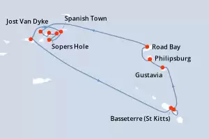 Itinerario : Philipsburg, Road Bay, Jost Van Dyke, Sopers Hole, Canal de San Francis Drake, Norman Island, Spanish Town, Islas Virgenes, Basseterre (St Kitts), South Friar's beach, Gustavia, Philipsburg