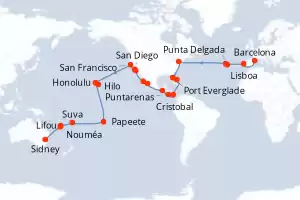 Itinerario : Barcelona, Lisboa, Punta Delgada, Praia da vitoria, Nueva York, Port Everglade, Half Moon Cay, Cristobal, Puntarenas, Puerto Quetzal, Puerto Vallarta, Cabo san Lucas, San Diego, Los Angeles, San Francisco, Honolulu, Hilo, Papeete, Suva, Lifou, Nouméa, Sidney
