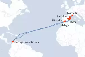 Itinerario : Barcelona, Marsella, Ibiza, Palma de Mallorca, Gibraltar, Malaga, Cartagena de Indias, Valencia, Barcelona, Marsella, Ibiza, Palma de Mallorca, Gibraltar, Malaga, Cartagena de Indias, Valencia, Barcelona