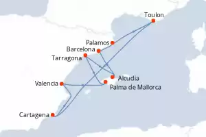 Itinerario : Barcelona, Toulon, Ajaccio, Cannes, Valencia, Ibiza, Palma de Mallorca, Alcudia