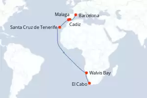 Itinerario : Barcelona, Malaga, Cadiz, Santa Cruz de Tenerife, Walvis Bay, Le Cap , Puerto Elizabeth, Port Louis, Muscat, Dubai