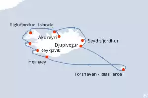 Itinerario : Reykjavik, Isafjordhur, Akureyri, Djupivogur, Torshaven - Islas Feroe, Lerwick, Maloy, Vik, Bergen, Haugesund, Stavanger, Southampton