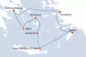 Itinerario : Kusadasi, Rodas, Agios Nikolaus (Crete), Santoríni, Mykonos, Milos, El Pireo Atenas, Kusadasi