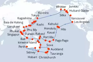 Itinerario : Los Angeles, Hilo, Kahului, Honolulu, Kauai, Pago Pago, Suva, Isla Dravuni, Port Vila, Luganville, Rabaul, kiriwina Island, Alotau, Cairns, Airelie Beach, Brisbane, Sidney, Auckland, Tauranga, Christchurch, Dunedin, Fjordland, Hobart, Adelaide, Perth, Kimberley Coast, Darwin, Bali, Lombok, Singapur, Phuket, Langkawi, Penang, Kuala Lumpur, Phu My, Cami Ranh, Baia de Halong, Hong Kong, Taipei, Miyakojima, Kagoshima, Kochi, Osaka, Tokyo, Miyako, Kushiro, Whittier, College Fjord, Hubard Glacier, Sitka, Juneau, Ketchikán, Vancouver, Los Angeles