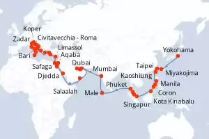 Itinerario : Yokohama, Miyakojima, Taipei, Kaoshiung, Manila, Coron, Puerto Princesa, Kota Kinabalu, Singapur, Port Kelang, Penang, Phuket, , Male, Mumbai, Dubai, Abu Dhabi, Doha, Dubai, Salaalah, Djedda, Safaga, Aqaba, Sharm El Sheikh, Sokhna, Limassol, Rodas, Efeso, El Pireo Atenas, Igoumenitsa, Bari, Zadar, Koper, Ravenna, Split, Dubrovnik, La Valetta, Messine, Sorrento, Civitavecchia - Roma