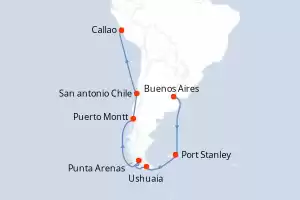 Itinerario : Buenos Aires, Puerto Argentino, Ushuaia, Punta Arenas, Puerto Montt, San antonio Chile, Callao