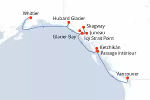 Itinerario : Whittier, Hubard Glacier, Glacier Bay, Icy Strait Point, Juneau, Skagway, Ketchikán, Passage intérieur, Vancouver